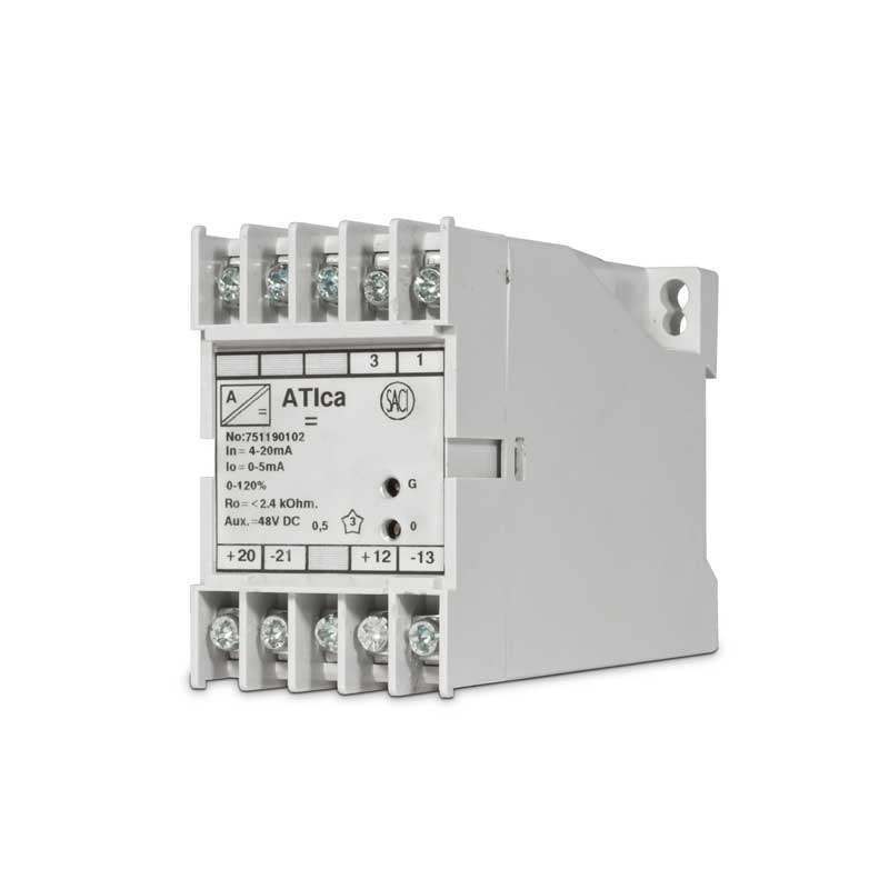 Los convertidores ATIca_ transforman una señal de intensidad de corriente continua en una señal de intensidad o tensión de corriente continua proporcional a la anterior. Requieren tensión auxiliar.
