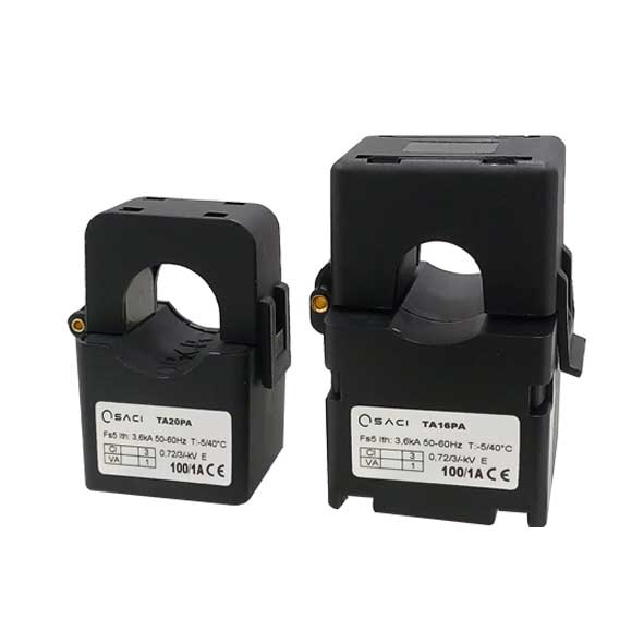 Mini transformador TA_PA de núcleo abierto para instrumentación de medida. Es un transformador de primario pasante para cable. Destaca por contener relaciones desde 20A hasta 200A en el primario y con salida en x/5A y x/1A.