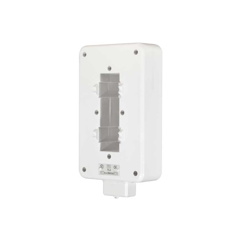 El transformador de corriente TL_ para instrumentación de protección. Es un transformador para primario pasante, bien para cable o bien para pletina. Su envolvente es de plástico.