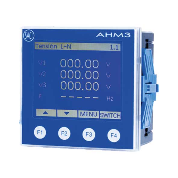 El analizador de red AHM3 está diseñado para el cálculo y la medida de las variables eléctricas de una red, tales como, tensión, corriente, frecuencia, potencia, factor de potencia, energía, componentes armónicos, etc. Memoria de 8 MB incorporada. El AHM3 está fabricado con material plástico ABS, Ul94 V0. Tiene unas dimensiones de 96×96 mm y de terminales regletas fijas. El peso del analizador es 0,4kg. La protección del panel frontal IP65 y el cuerpo IP20. La temperatura de funcionamiento tiene un rango -10/60ºC de operación y -25/70ºC de cuerpo.