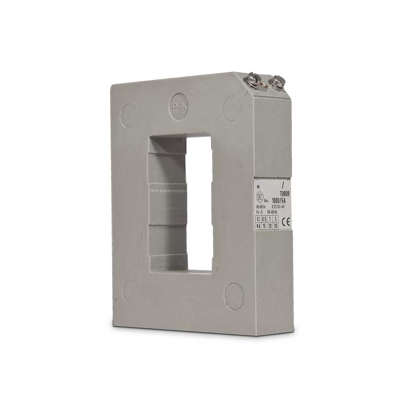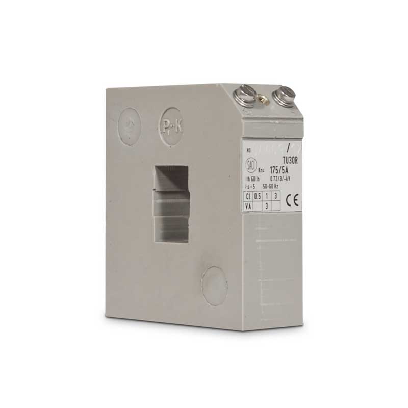 El transformador de corriente TU__R para instrumentación de medida. Es un transformador para primario de pletina pasante. Su envolvente es de resina, lo que le confiere una especial robustez y cuentan con perfil estrecho lo que permite una mejor adaptación en el cuadro por sus reducidas dimensiones.
