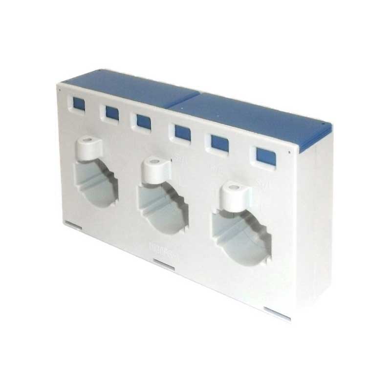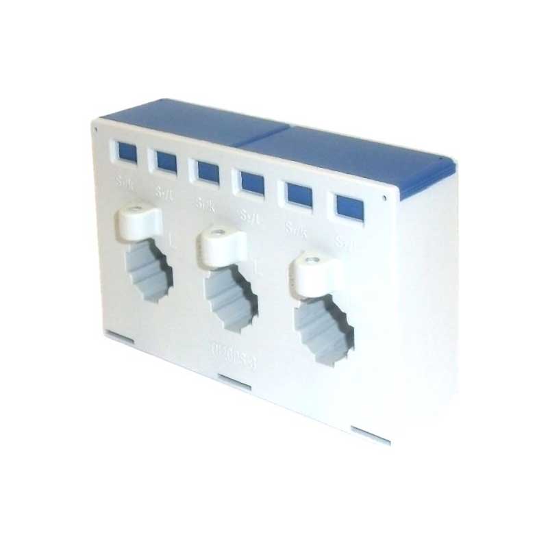 El transformador de corriente TU__PS-3 para instrumentación de medida está diseñado para sistemas trifásicos. Es para primario pasante, bien de cable o bien de pletina. Su envolvente es de plástico. Cuentan con perfil estrecho, y como tienen las tres fases en el mismo equipo permiten una mejor adaptación en el cuadro por sus reducidas dimensiones.
